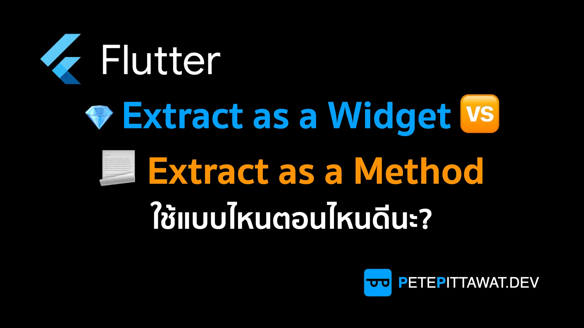 2 วิธีหลัก ๆ ที่เรามักใช้กันในการสร้างความเป็นระเบียบของวิดเจ็ตทรี (Widget tree) ของเรานั่นคือ การแยกส่วนของโค้ดออกเป็นวิดเจ็ต (Extract as a Widget) และการแยกส่วนของโค้ดออกเป็นเมธอด (Extract as a Method) แน่นอนว่าทั้งสองแบบนั้นต่างช่วยให้เราสามารถนำโค้ดไปใช้ซ้ำได้ (Reusable code) แต่ควรจะใช้แบบไหนเมื่อใด และมีอะไรที่ต้องคำนึงถึงบ้าง บทความนี้จะพาไปตอบคำถามนั้น